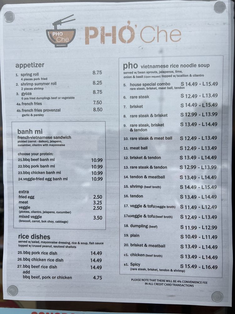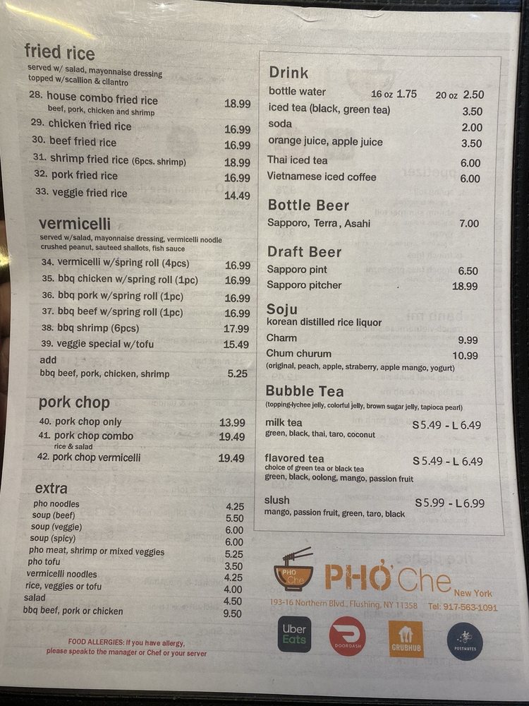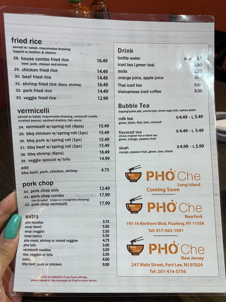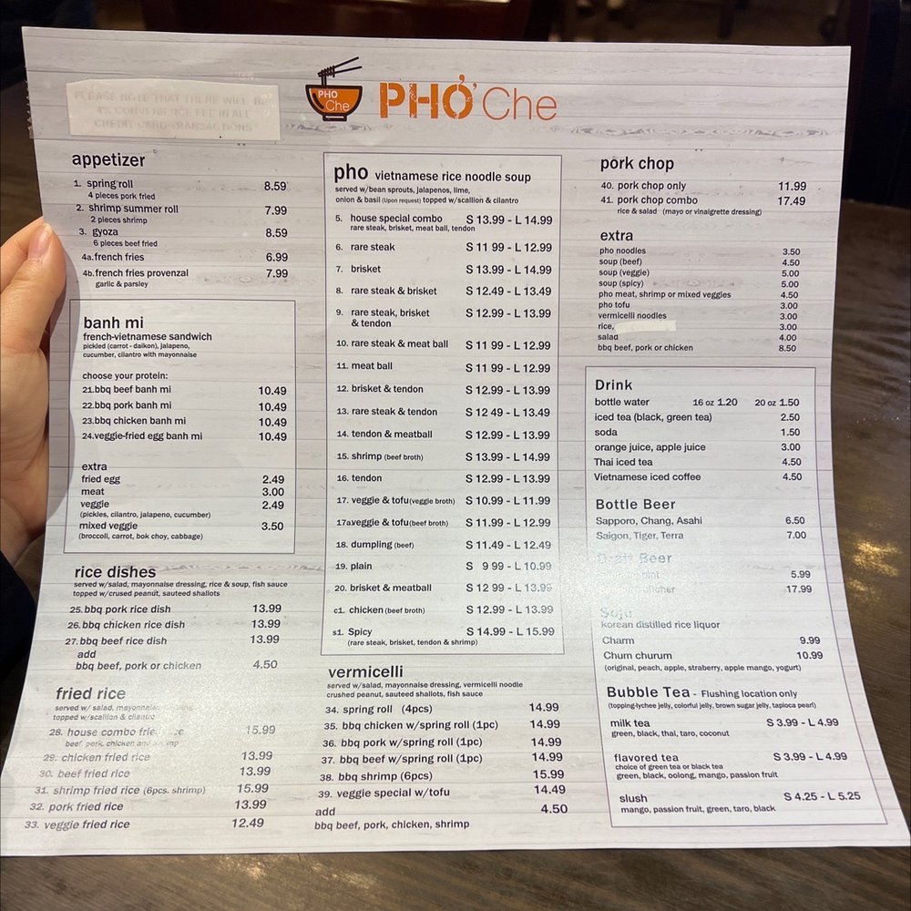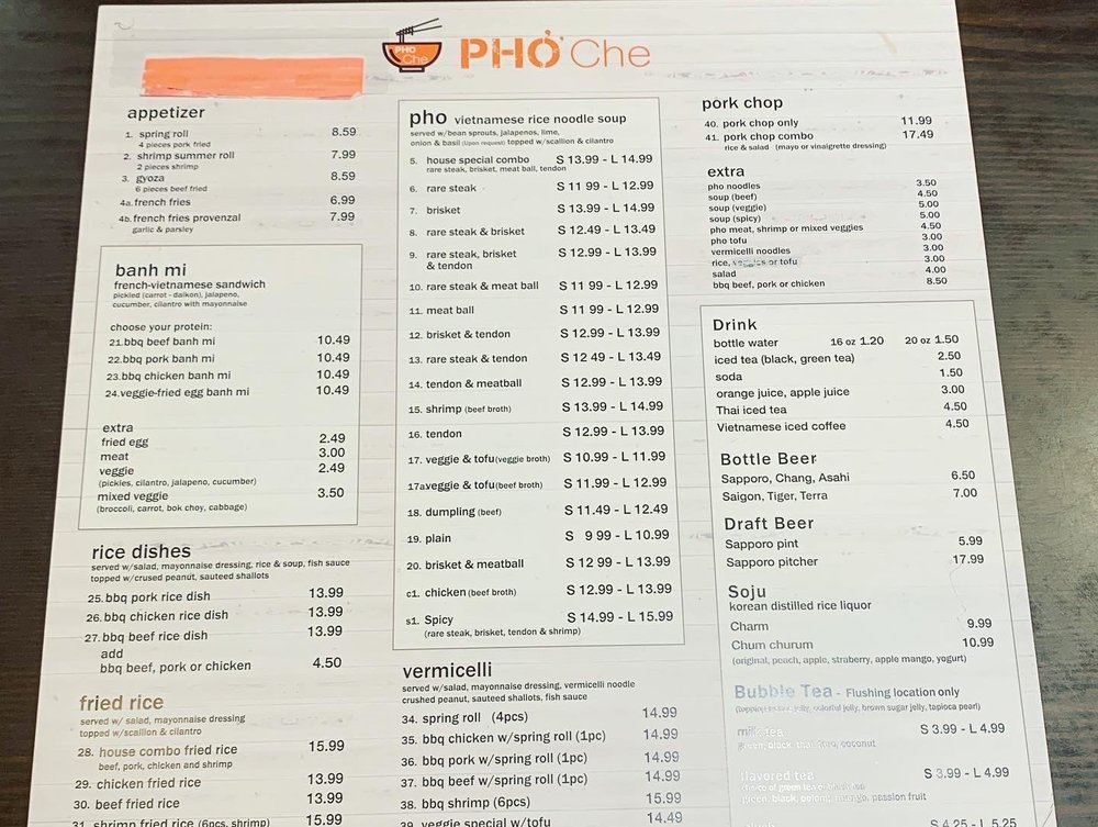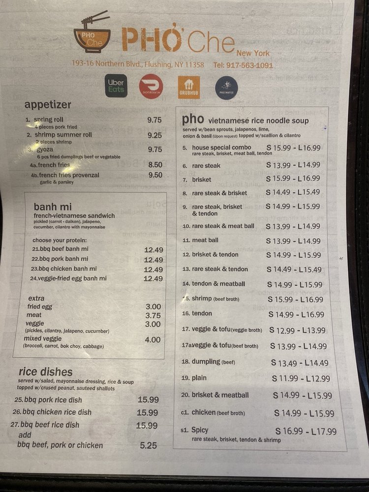 Welcome to Pho Che, a Korean-Vietnamese restaurant located in Flushing, NY. Offering delivery, takeout, reservations, and a variety of dining options, Pho Che is a must-visit for foodies in the area. With a menu featuring flavorful appetizers like Spring Rolls and Gyoza, as well as delicious Banh Mi sandwiches and traditional Pho Rice Noodle Soups, there is something for everyone to enjoy. The House Special Combo Pho, packed with rare steak, brisket, meatball, and tendon, is a standout dish that will satisfy your cravings. The casual atmosphere and friendly staff make dining at Pho Che a pleasant experience. Don't forget to try their Happy Hour specials and enjoy outdoor seating. Whether you're a meat lover or a vegan, Pho Che has options for everyone. Don't miss out on the tasty dishes served at this gem of a restaurant.